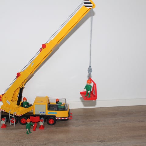 PM 6860. Playmobil gravemaskine i orange og hvid plastik. Legetøjsgravemaskinen har bevægelig arm og skovl samt førerhus med figur. Bagklappen kan åbnes og viser motor- og maskindetaljer.