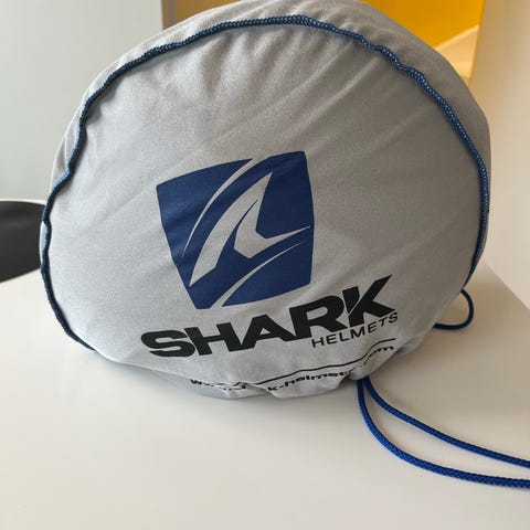 Shark Skwal 2 motorcykelhjelm i sort/blå med grafiske detaljer. Hjelmen har klart visir og integreret ventilation i toppen og bagtil. Modellen er velegnet til brug på motorcykel og scooter. Medfølgende opbevaringspose fra Shark er inkluderet på billederne.