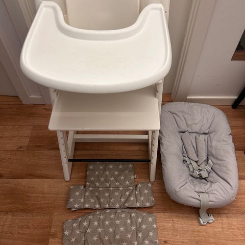 Højstol i hvidbejstet træ. Højstolen har justerbar siddeplade og fodplade, så den kan tilpasses barnets højde.