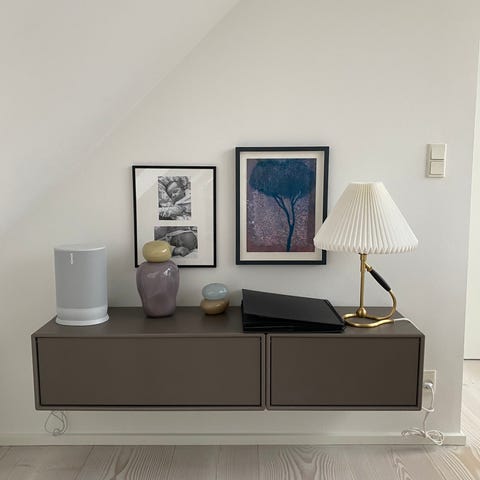 Møblet indeholder tre sektioner - to skuffer og en midtersektion med en perforeret klaplåge, der gør det nemt at betjene enheder og samtidig bevarer de rene linjer.