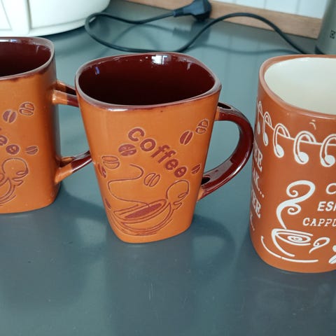 Keramik, Krus nye, Asbo retro krus, 4 flotte retro krus i sten tøj fra Asbo, flotte stilrene farver,H 9 cm D8 cm