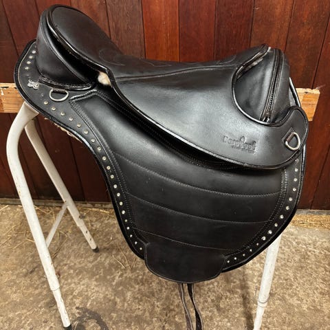 Barefoot westernsadel i brun læder. Sadel i westernmodel med dyb sædeform og udskåret mønster i læderet. Undersiden er foret med blødt materiale for komfort til hesten. Sadlen har flere D-ringe til fastgørelse af udstyr og leveres med tilhørende sadelovertræk og underlag fra Barefoot. Velegnet til westernridning og turbrug.