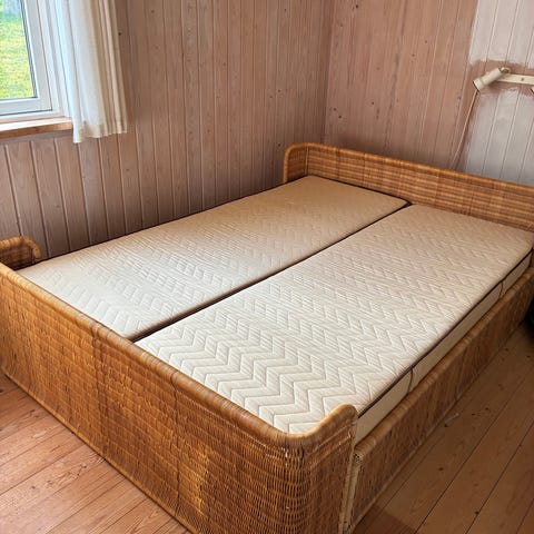 Fin seng i massiv fyr. Topmadras medfølger og sengetæppe kan medfølge, hvis du ønsker det. Højden på 60 cm. er inkl. madrasser.