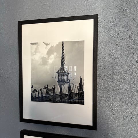 Værket er smukt indrammet med hvid passepartout i en elegant mørk ramme, der fremhæver de fine detaljer i raderingen.