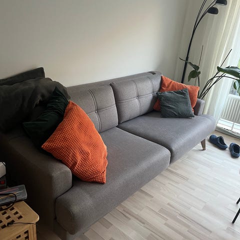 To personers sofa, blå, som ny- aldrig brugt, har kun stået til pynt. Ukendt mærke. Står i Roskilde