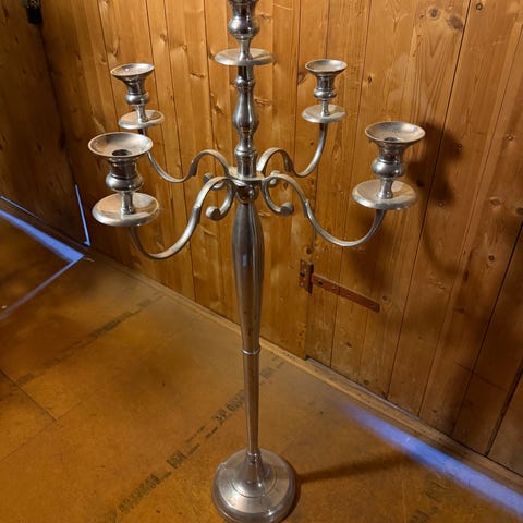 Kæmpe gulvstage i sølvfarvet metal. Klassisk kandelaber-design med fem arme til stearinlys eller bloklys. H: 152 Ø 66