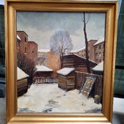 Henning Hougaard oliemaleri med dompapper vintermotiv i træramme