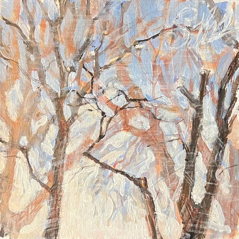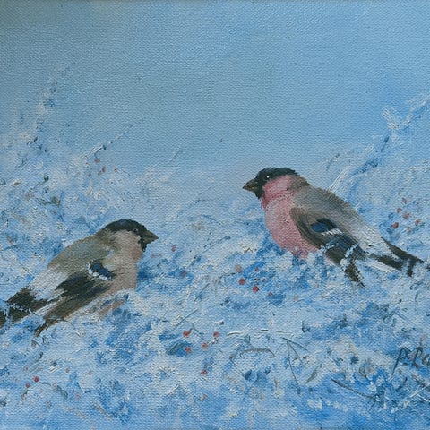Maleri af Henning Hougaard (1922-1995) med motiv af dompapper på en gren i vinterlandskab. Farverne er primært lyse blå og hvide nuancer med rosa/røde fugle i original ramme. Rammemål: 63 x 54 cm