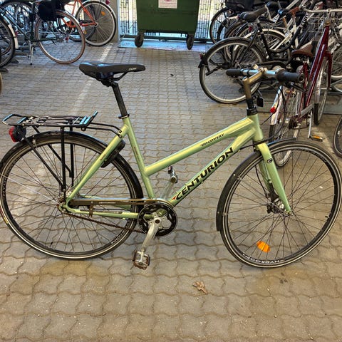 Centurion damecykel med 53 cm stel og 28"/700c hjul. Cyklen har et klassisk dame stel med lige styr og sadel i standardhøjde. Udstyret med bagagebærer og skærme, egnet til daglig transport og pendling. Farven er en blågrøn metallic nuance. Velegnet til kvinde med behov for en praktisk hverdagscykel med almindelig kørestilling. Indstillelig styrpind og 24 udvendige Shimano gear. God til stejle bakker. Aluminium 7005 stel. Kan leveres i Aarhus mod betaling.