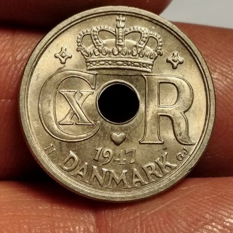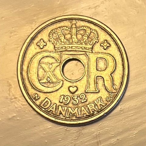 Danmark 25 øre mønt fra 1933 med hul i midten. Forsiden viser kongekrone og monogram samt årstal og landebetegnelse. Bagsiden har pålydende værdi 25 øre og dekorative mønstre omkring hullet. Egnet til samlere af danske mønter og historisk valuta.