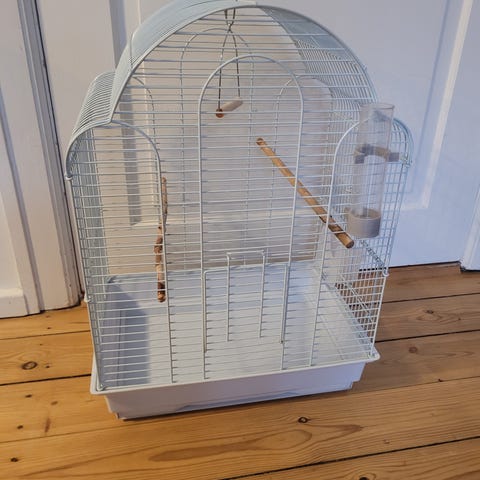 Fugle bur B 60, D 33, H 57, brugt god stand sælges som viste på billedet. På billedet 4 du kan se at den er lidt flækket og lavet fungerer som den skal, med vand og mad skål plus badekarret Kr 300.