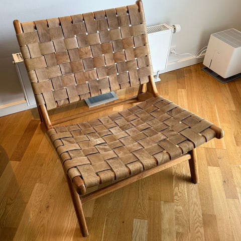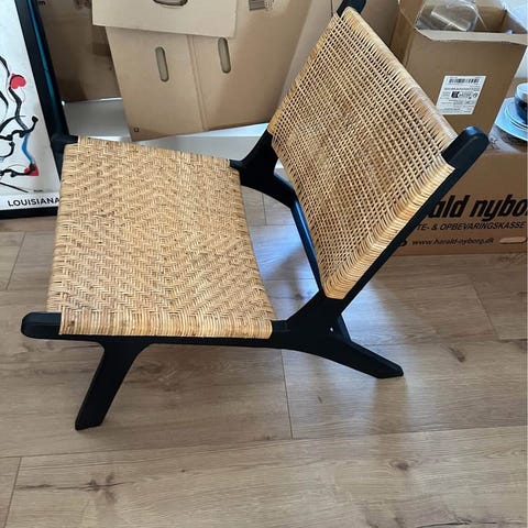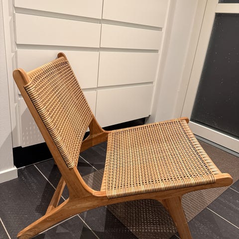Stol loungestol i naturtræ med sæde og ryg i flet. Lav siddedybde og skråtstillede ben, velegnet som loungestol i stue, soveværelse eller læsehjørne. Neutrale naturfarver der passer ind i mange indretninger.