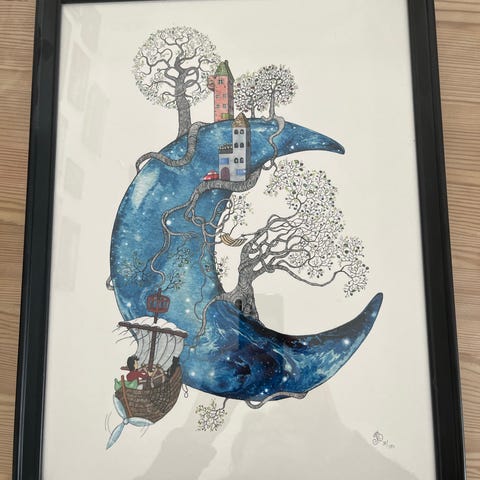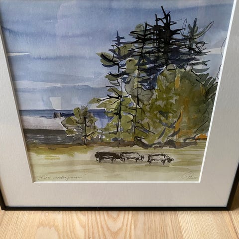 Gurli Hansen akvarel i sort ramme. Købt i værkstedsgalleri på Samsø.