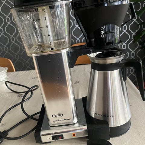 Moccamaster kaffemaskine. Glaskanden står på varmeplade på basen, som har separate tænd/sluk-knapper.