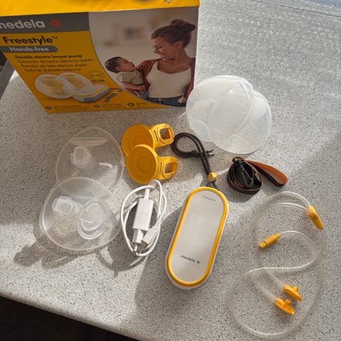 Medela Freestyle brystpumpe med tilhørende flasker og tilbehør. Sættet omfatter elektrisk pumpeenhed, brysttragte i flere størrelser, slanger, låg, suttehoveder og opbevaringsflasker. Egnet til udpumpning og opbevaring af modermælk. Velegnet til brug derhjemme eller på farten, hvor der er behov for en kompakt og bærbar brystpumpe med ekstra dele og beholdere.