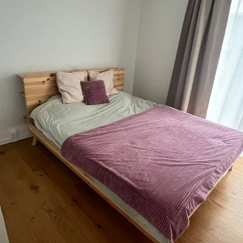 Træseng lavet af runde stokke. Fremstår som helt ny. Opmagasineret i tør og ren kælder.