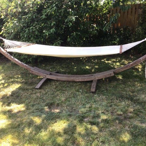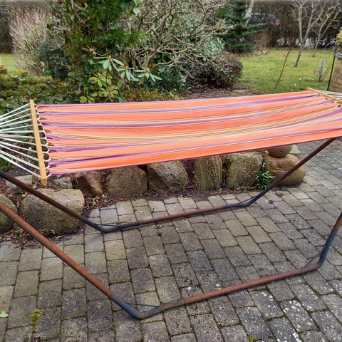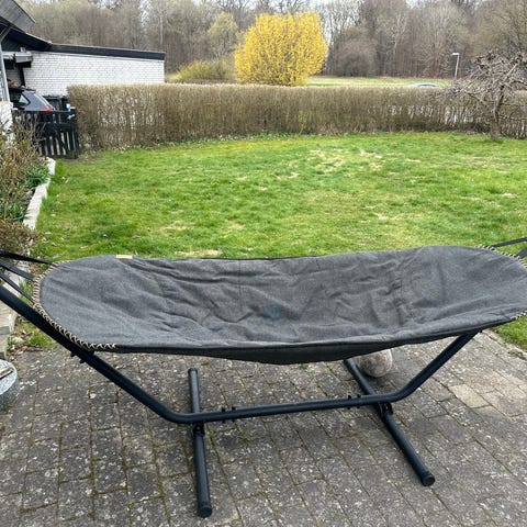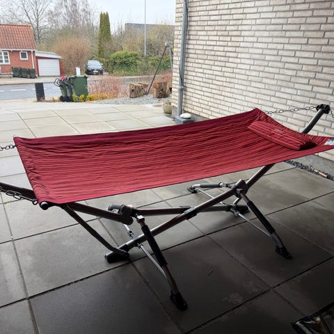 Fatboy hængekøje med stativ i lilla. Hængekøjen er polstret og har en blød liggeflade. Den er monteret på et fritstående stativ, som kan placeres på terrasse, altan eller i haven. Velegnet til udendørs brug, hvor der er behov for en selvstændig hængekøje uden ophængspunkter i træer eller vægge.