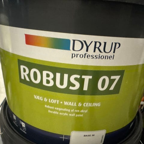 Dyrup Robust 05 væg- og loftmaling er en akrylmaling til indendørs brug på vægge og lofter. Spanden indeholder 9 liter maling. Serien Robust 05 er velegnet til almindelige opholdsrum, hvor der ønskes en slidstærk og vaskbar overflade med glans 5. Malingstypen kan anvendes på underlag som puds, beton, gips og tidligere malede flader, når de er korrekt forbehandlet efter producentens anvisninger.