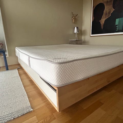 seng med opbevaringsskuffer under sengerammen. Skufferne trækkes ud fra siden af sengen. Sengen placeres direkte på gulvet uden synlige ben og står op ad væggen. Mærket er ikke IKEA (mærket er ukendt)