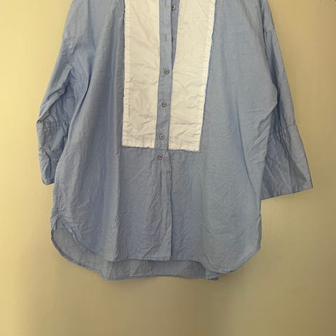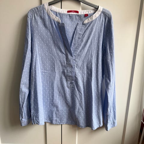 Skjorten er blå med hvidt prikket mønster og har lange ærmer