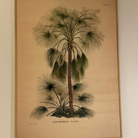 Tryk/litografi med palme motiv i grønne nuancer. Indrammet i sølvfarvet ramme, der måler 113 x 85