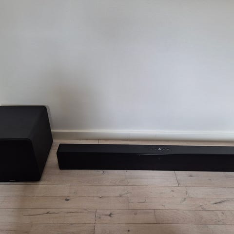 Arvani soundbar med trådløs subwoofer i sort pianolak. Systemet består af en soundbar og en separat trådløs subwoofer til basgengivelse. På soundbaren findes flere tilslutningsmuligheder, herunder optisk indgang samt analoge line-indgange (RCA). Der medfølger strømforsyning og fjernbetjening som vist på billederne. Velegnet til brug sammen med tv eller andre lydkilder, hvor man ønsker lyd via soundbar og separat subwoofer.
