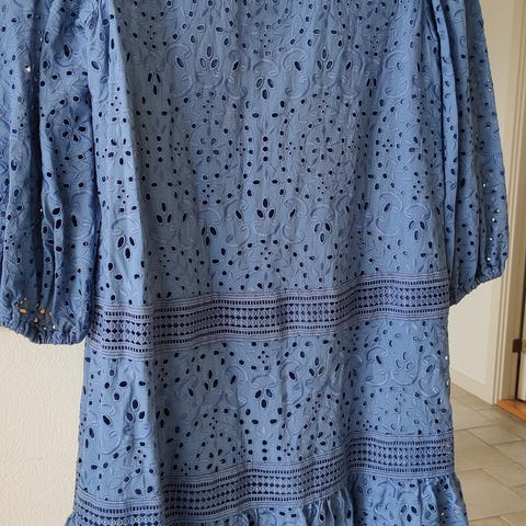Pigalle hverdagskjole til kvinder i str. M. Kjolen er blå og fremstillet i bomuld. Modellen har lange ærmer med knaplukning og lille flæsekant ved ærmerne. Foran er der dekorative detaljer langs brystpartiet, og kjolen har elastik i taljen samt flæsekant forneden. Velegnet som hverdagskjole.