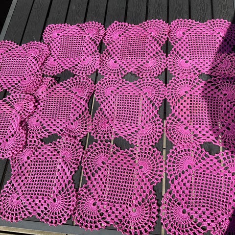 12 stk. hjemmehækler lilla mellemlægsservietter i bomuldsgarn. 15x15 cm. Samlet pris.