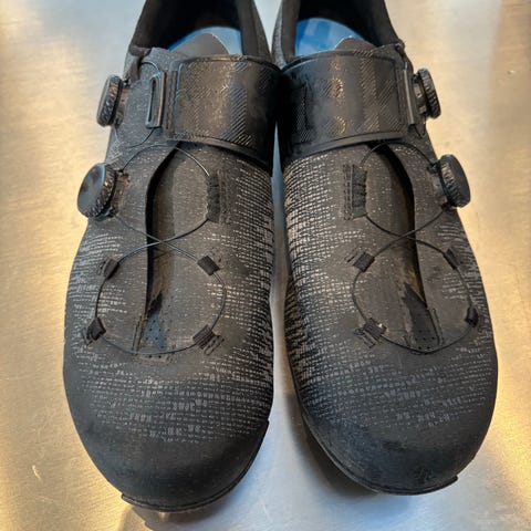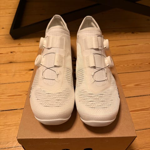 Fizik cykelsko i størrelse 44. Fede sko der desværre er for smalle til mig. Skoene er med carbon sål og vejer ca. 570 g for parret. Skoene er grå med grøn inderside og detaljer. Lukning med drejespænde og velcrostrop for justerbar pasform. Sålen har beslag til montering af klamper til klikpedaler. Velegnet til landevejscykling eller træning på cykel med kompatible pedaler.