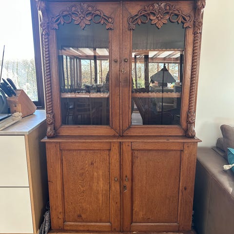 Behandlet med sort/mørkegrå kalkmaling med voks med enkelte brugsspor. Skabet kan rengøres, genbehandles eller males. Smukt gammelt skab med hylder, låger og messingbeslag.