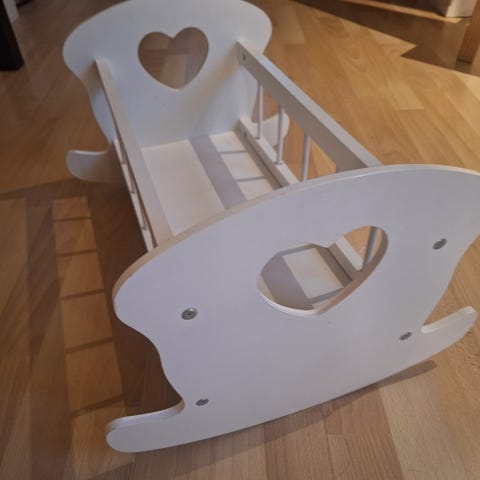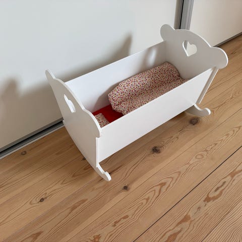 Dukkevugge fra Happy Friends i træ. Dyne og pude medfølger. I denne vugge sover dukken sødt hele natten :-)