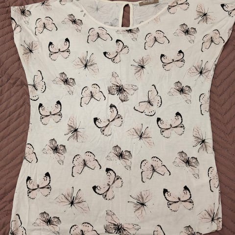 Tank top S, tynd sommer, sort hvid, elastisk, let og luftig. Som ny, brugt en enkelt gang, men er for lille. Bryst 32 – 42cm. Længde 60cm. Vejer 52g.