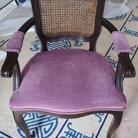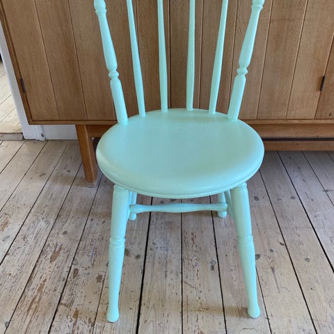 Gammel træstol. Malet turkis. Grå velour polstring. Kunne godt trænge til ombetrækning. Lav siddehøjde/lænestol. Har bare været brugt til pynt og aflægning .