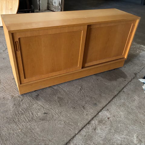 Lav smal skænk af teak træ, front med to skydelåger af glas, indvendig med hylder. Pæn stand. Udført hos Skovby Møbler.