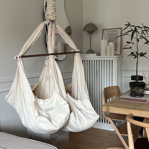 Moonboon - babyhængevugge i naturfarvet tekstil med motorenhed til ophæng i loft eller dørkarm. Vuggen er udført i bomuldslærred med polstret madras/indsats for øget komfort. Motoren har indstillinger for tempo og timer, så vuggebevægelsen kan reguleres efter behov. Egnet til spædbørn, der skal ligge ned, og kan anvendes som sove- og hvileplads i hjemmet, hvor der er mulighed for sikker montering i loft eller døråbning.