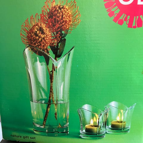Erik Bagger Nature sæt bestående af én vase og to fyrfadsstager i klart glas. Vasen er formet med bløde, organiske kanter og er egnet til blomsterdekoration. Fyrfadsstagerne har samme formsprog og passer til standard fyrfadslys. Sættet er udført i glas og kan anvendes samlet eller hver for sig som enkel bord- eller vinduesdekoration. Det er ikke Ikea.