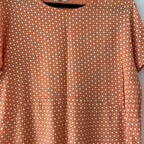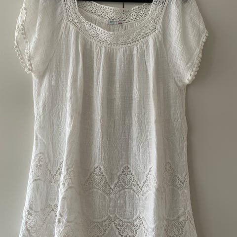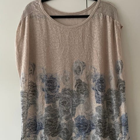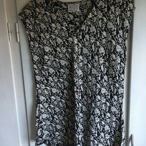 Sommerbluse fra Soyaconcept, rund hals, ingen ærmer, beige/hvid. Størrelse 42 Tror det er viscose. Kan sendes.