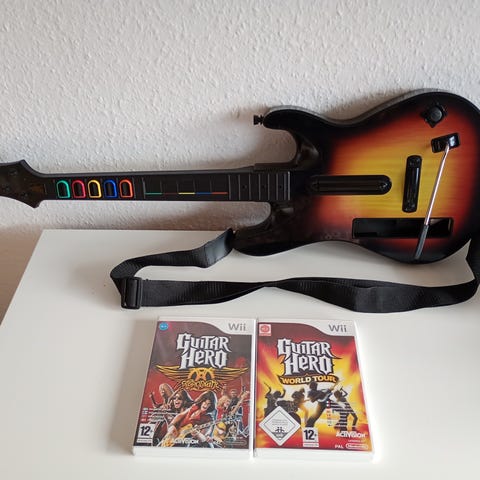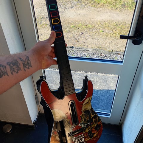 Guitar Hero Metallica trådløs guitarcontroller til Playstation. Controlleren er udformet som en elguitar med rød front og motiv fra Guitar Hero Metallica. Den har fem farvede knapper på gribebrættet, strum bar, whammy bar og start-/select-knapper. Med justerbar skulderrem og trådløs sender med kabelstik til kompatibel konsol. Velegnet som inputenhed til Guitar Hero-spil og lignende musikspil.