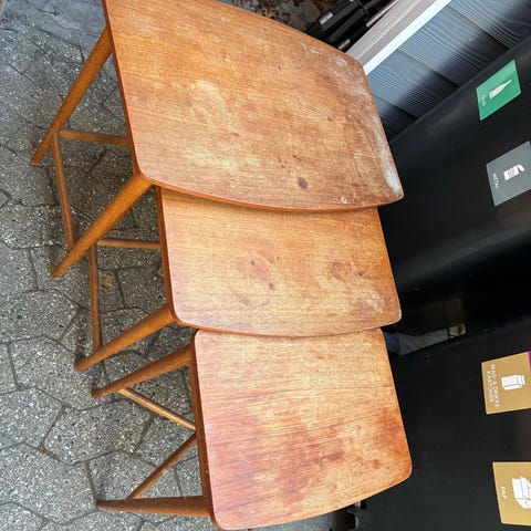 Fint, nyt sæt med 3 indskudsborde i massivt, rustikt træ (akacie/sheesham). Bordene er både praktiske og dekorative, da de nemt kan stables under hinanden eller bruges hver for sig . H: 80-90-100 cm. Afhentes I Ringsted.
