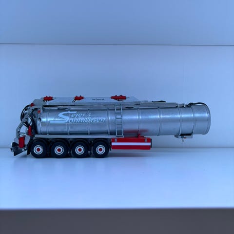 Model lastbil som tankvogn med rød førerhus og sølvfarvet tanktrailer. Lastbilen leveres i original æske med plastindsats. Egnet som samlerobjekt eller legetøj til børn, afhængigt af producentens anbefalinger. Detaljeret udførelse med flere aksler på trailer og træk. Målestok og producent er ikke oplyst.