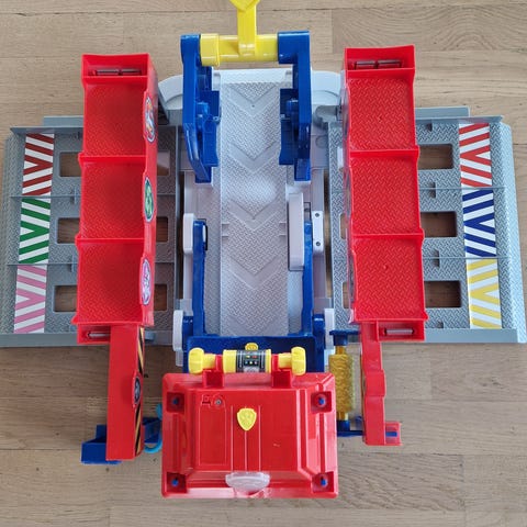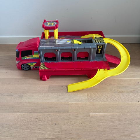 Lastbil med bilgarage. De ting som ses på billedet medfølger. Fin til leg.
