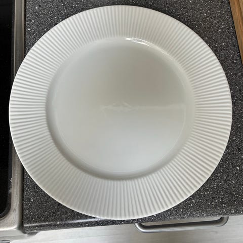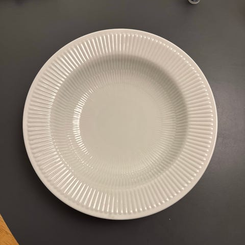 Sælger to Royal Copenhagen hvid riflet coupe middags/frokosttallerkener i hvidt porcelæn med riflede detaljer langs kanten. Tallerkenen måler 23 cm i diameter.
