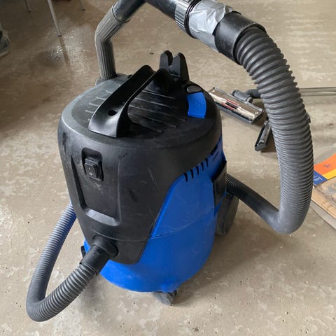 Dyson støvsuger med beholder og fleksibel slange i grå og rød. Støvsugeren har gennemsigtig støvbeholder, så indholdet kan ses, samt rør og mundstykke til gulvrengøring. Velegnet til almindelig rengøring af gulve og andre overflader i hjemmet.
