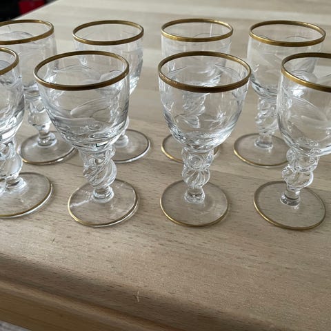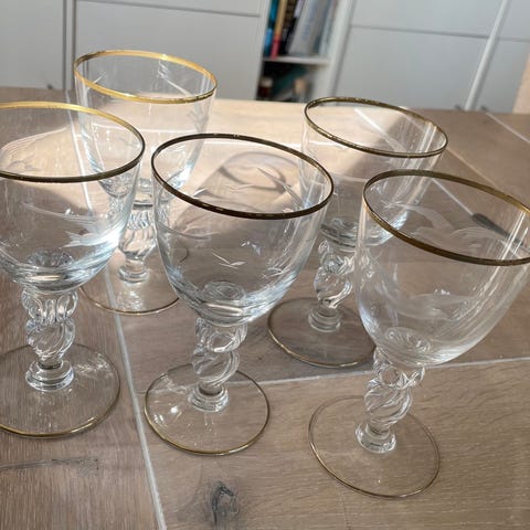 Lyngby Måge glas, kendetegnet ved de slebne måger og guldkanten. Prisen er sat attraktivt for alle 7.