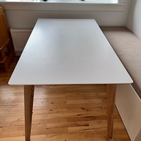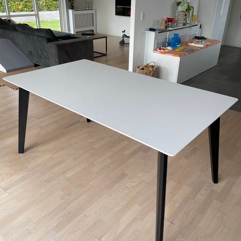 Bordpladen er i hvid laminat med sorte ben. Bordpladen er nem at vedligeholde.