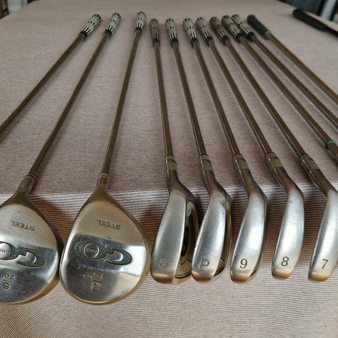 Golfsæt bestående af golfbag med flere forskellige jern, køller, wedges og putter. Sættet indeholder både driver, fairway og hybridkølle samt forskellige jern - 11 stk. i alt