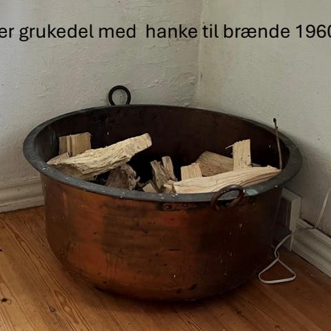 Stor gammel gruekedel med smuk patina. Diameter er 55 cm, højden er 30 cm.