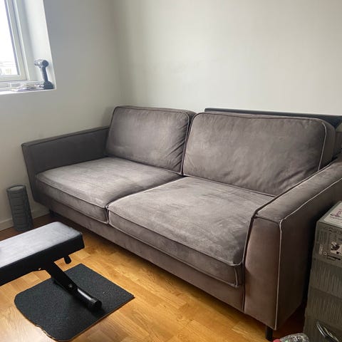 Sælger denne Ilva Scott 3 personers sofa med tilhørende sofa puf. Den har generelt slid og brugsspor, med nogle få pletter som ikke lige kan fjernes, og et lille hul på ydersiden (se billeder). Sælges kun samlet! :)