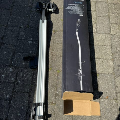 Thule cykelholder til montering på tagbagagebærer. Holderen er udført i aluminium med sorte plast- og metaldele. Den har låsbar fatning ved forhjulet, justerbar bøjle til stellet samt rem til fastgørelse af hjul. Egnet til transport af én cykel på bilens tag, forudsat kompatibilitet med bilens tagbøjler og monteringssystem.