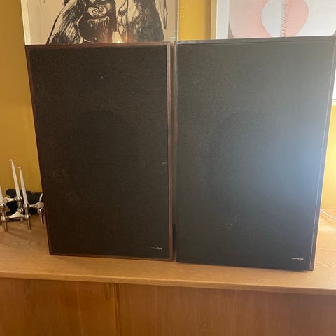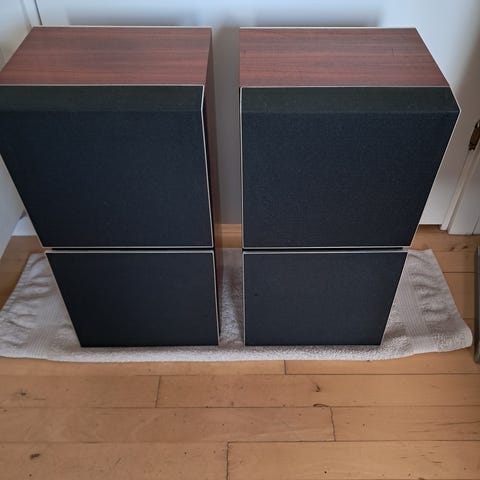 Bang & Olufsen højttalere (sæt) beovox S2002 serial no 2563627 med rektangulært trægabinet og sort frontstof. Kabinettet fremstår i mørkt træ med lyse kanter. Højttalerne er passive og tilsluttes via kabler på bagsiden. Egner sig til brug sammen med forstærker eller anlæg i stue eller lytterum, hvor der ønskes klassisk B&O-design med træfinish
